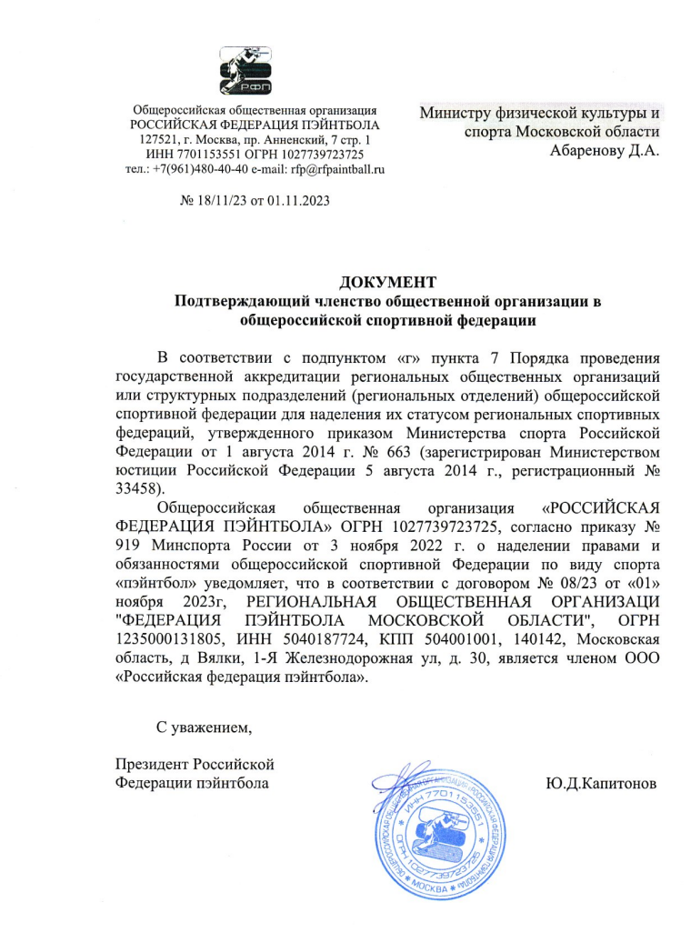 Региональная общественная организация Федерация пэйнтбола Московской области является является организатором всероссийских спортивных соревнований по виду спорта "Пэйнтбол" (Код вида спорта №0760002211Я) на территории Московской области. Спортивные соревнования проводятся в соответствии с правилами вида спорта «пэйнтбол», утвержденными приказом Министерства спорта Российской Федерации от 23 марта 2020 г. № 240.